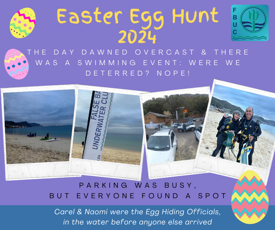 That is what we discovered the day before our advertised FBUC Underwater Easter Egg Hunt 😆. Much as we had plotted and schemed (having it a week early to avoid disrupting the Easter long weekend), it turned out that there was a ATB swimming event on at Long Beach, Simon's Town.